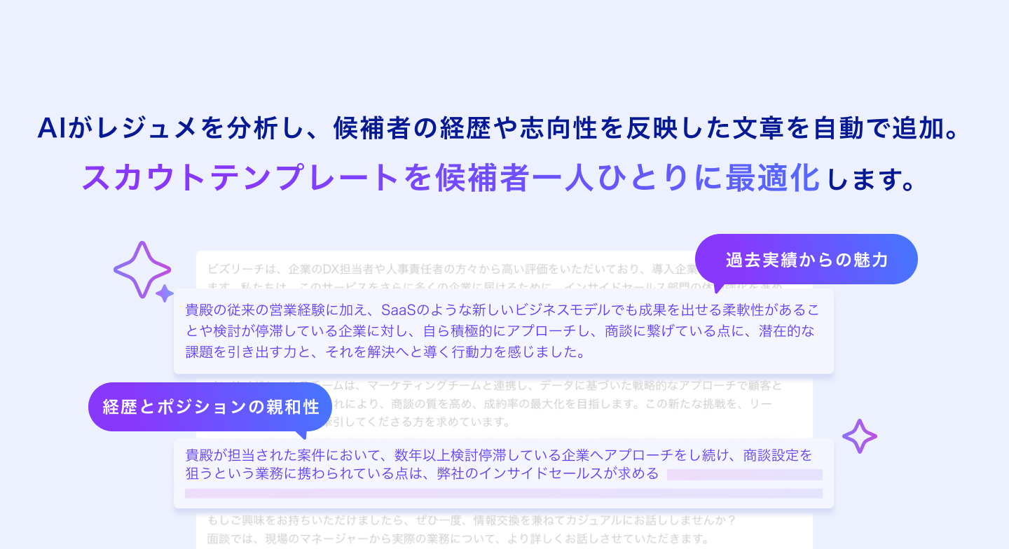 求人情報と候補者の職務経歴書情報を分析し、候補者一人一人の志向を反映した魅力的なスカウト文を作成する機能です。即戦力人材に特化したスカウト文を作成することで、返信率の向上およびマッチング機会の最大化の実現を図ります。