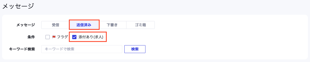 (2)「メッセージ」画面上部に表示されている項目「メッセージ」の「送信済み」をクリックし、その下の「条件」で「添付あり(求人)」にチェックを入れると、スカウト送信済みの候補者だけが表示されます。