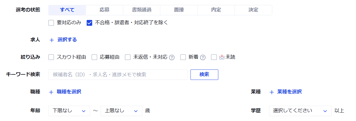 ※デフォルトの状態では、「不合格・辞退者・対応終了を除く」にチェックが入っています。